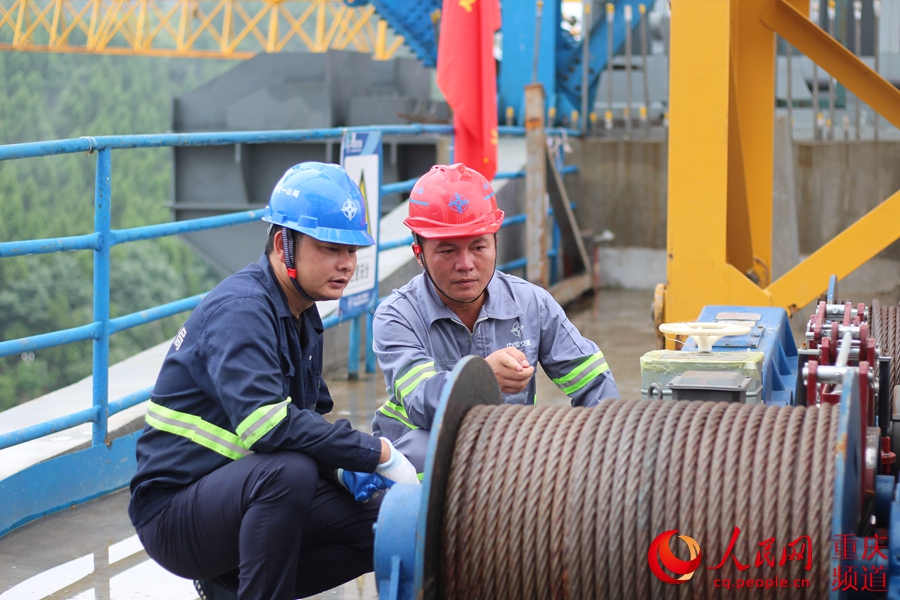 拆裝橫向支撐設(shè)備前,李廣輝與工友一同檢查卷揚(yáng)機(jī)的安全性能。中交一公局 供圖